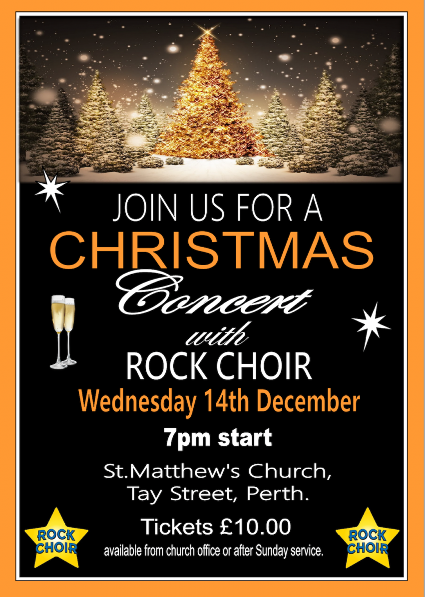 Join us for a a Christmas Concert with Rock Choir – 7pm, Wednesday 14th December – St Matthew’s Church, Tay Street, Perth – tickets £10 – available from the church office or after the Sunday service.